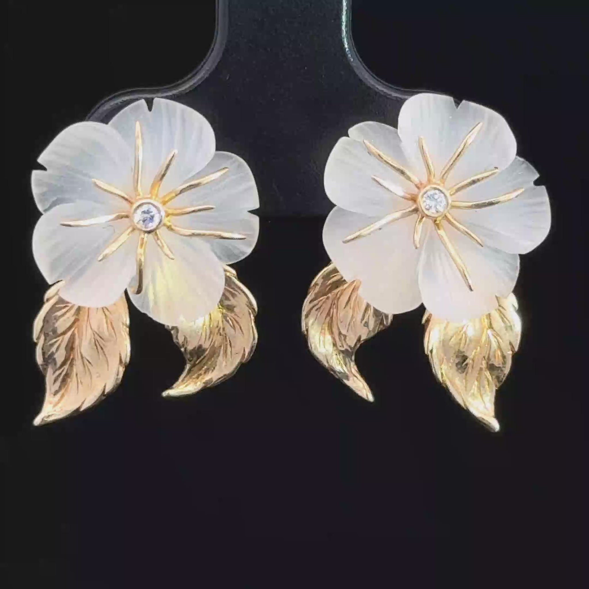 These exquisite floral earrings feature delicate petals crafted from translucent material, accented with shimmering gold leaves. At the center of each flower is a sparkling gemstone that adds a touch of brilliance to the design. Perfect for adding an elegant and feminine touch to any outfit.