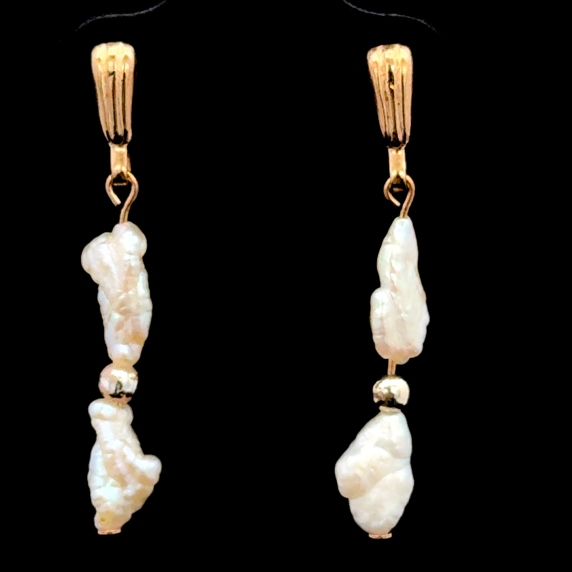 These stunning pearl drop earrings are the perfect accessory for any occasion. Crafted with exquisite attention to detail, they feature unique, irregular pearls that add a touch of elegance and sophistication. The gold accents beautifully complement the natural luster of the pearls, making these earrings a must-have for your jewelry collection.