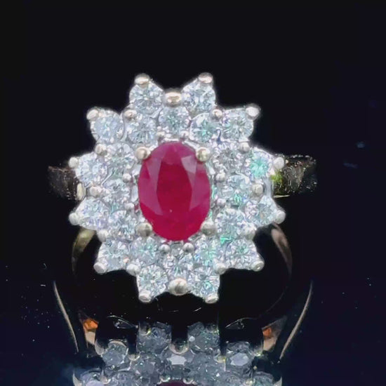 This exquisite ring features a stunning oval-shaped ruby at its center,of aproximately 0.75cts surrounded by a halo of sparkling diamonds of approximately 1.25 cts. The intricate design and the brilliant gemstones make this piece an epitome of elegance and luxury.