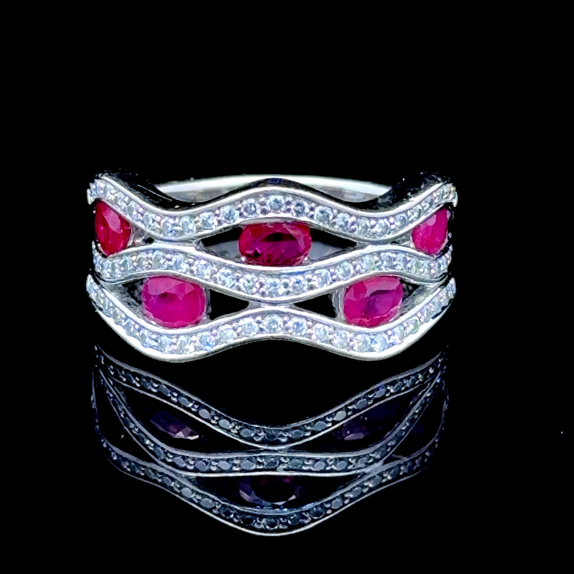 Elegant multistone ring crafted in lustrous white gold, featuring vibrant red rubies. The oval-shaped rubies are set within a meticulously designed band, complemented by beautiful diamonds, creating a captivating piece of jewellery. Perfect for adding a touch of sophistication and colour to any ensemble.